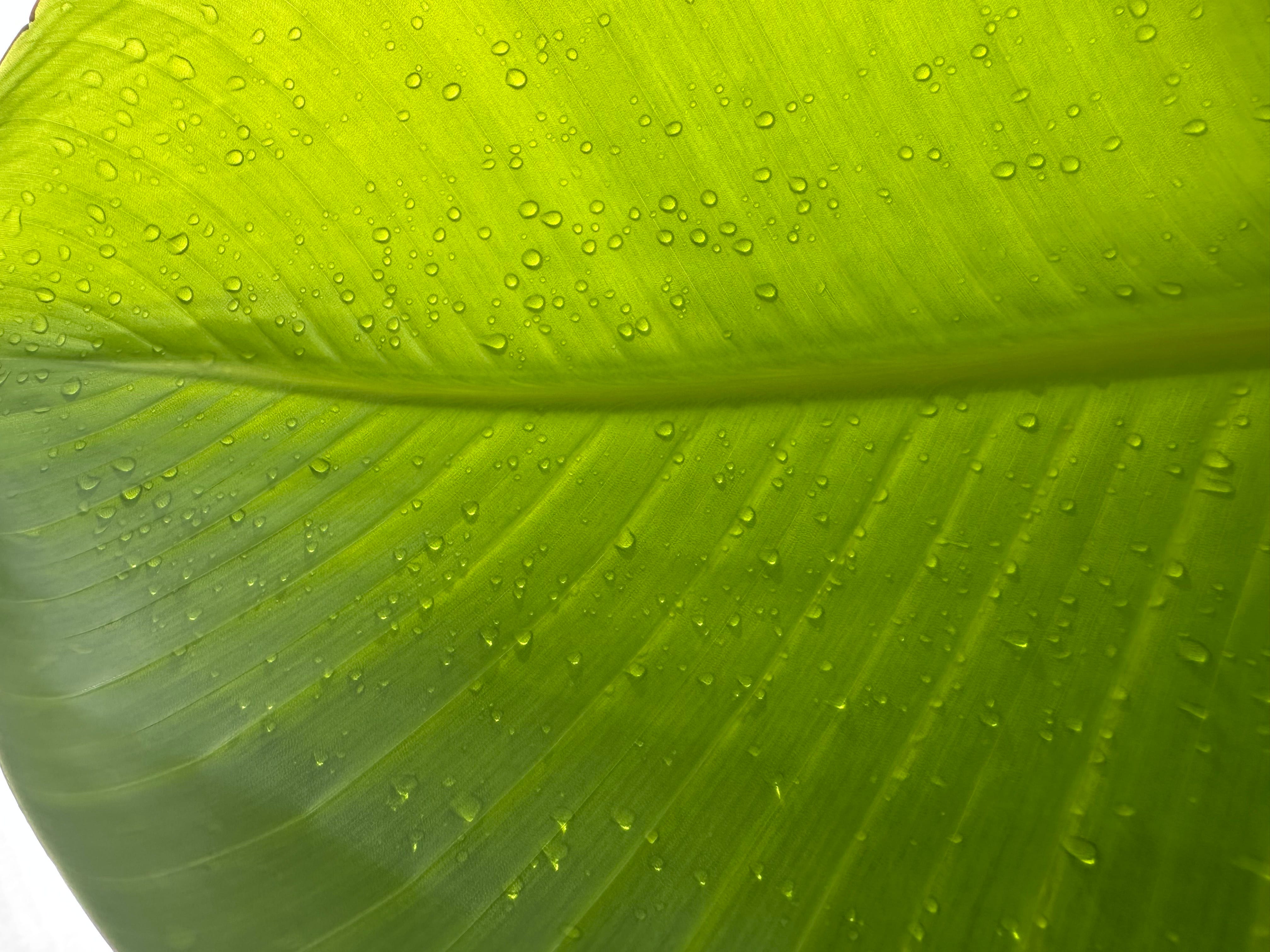 New leaves + fresh rain = pure delight — Our Bird of Paradise just sprouted a grand new leaf and it was a joy to watch it beautifully roll open. What made it even more joyful was witnessing the new leaf after a good rainstorm. Post-storm, when everything feels cleansed and scrubbed anew, unpredictable pearls of rainwater anoint the young ribs of the leaf. I strummed my finger along them, listening to this new rhythm of life with pure wonder. Welcome to the world new leaf.