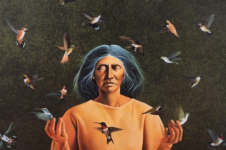 “Reunion” painting by Frank Howell — I feel like somehow this painting has been buzzing around my periphery for a while now. And then, all of a sudden, here it is, in my line of vision with my full attention. If I close my eyes and hold my hands out, I can almost feel the hummers surrounding me too. Thank you for sharing your gift, Frank.